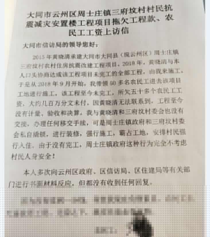 2020年5月8日早上,在山西大同云州区(原大同县,以下称为大同县)周士庄镇干活的老王万万没有想到,自己的工地一夜之间就被别人霸占,工地的大门被撬,一栋楼里所有防盗门的锁芯被换。而他们干活的工钱分文未拿到,欲哭无泪的农民工多次向当地政府有关领导申诉,却屡遭推诿,至今无果。