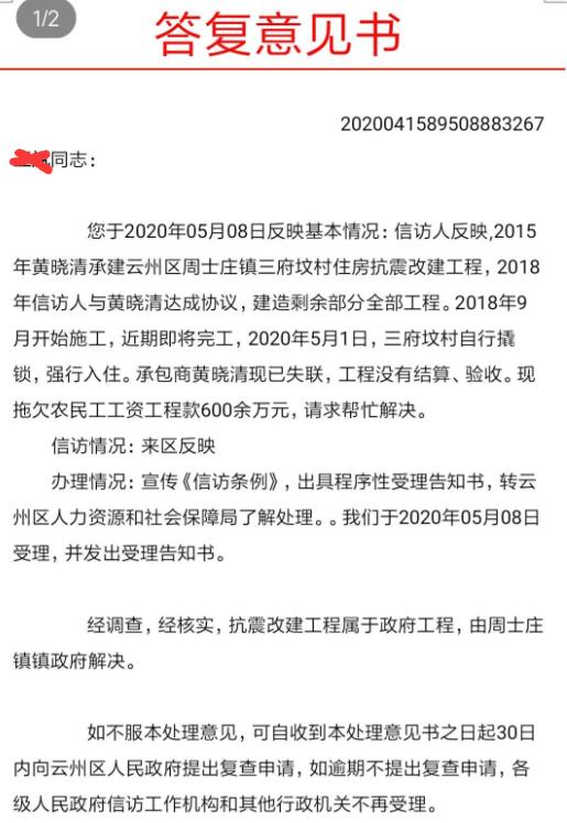 5月8日当天,老王将拖欠农民工工钱的事反映到云州区信访局,后转至云州区人力资源和社会保障局,经调查核实,抗震改建工程属于政府工程,由周士庄镇政府解决。
