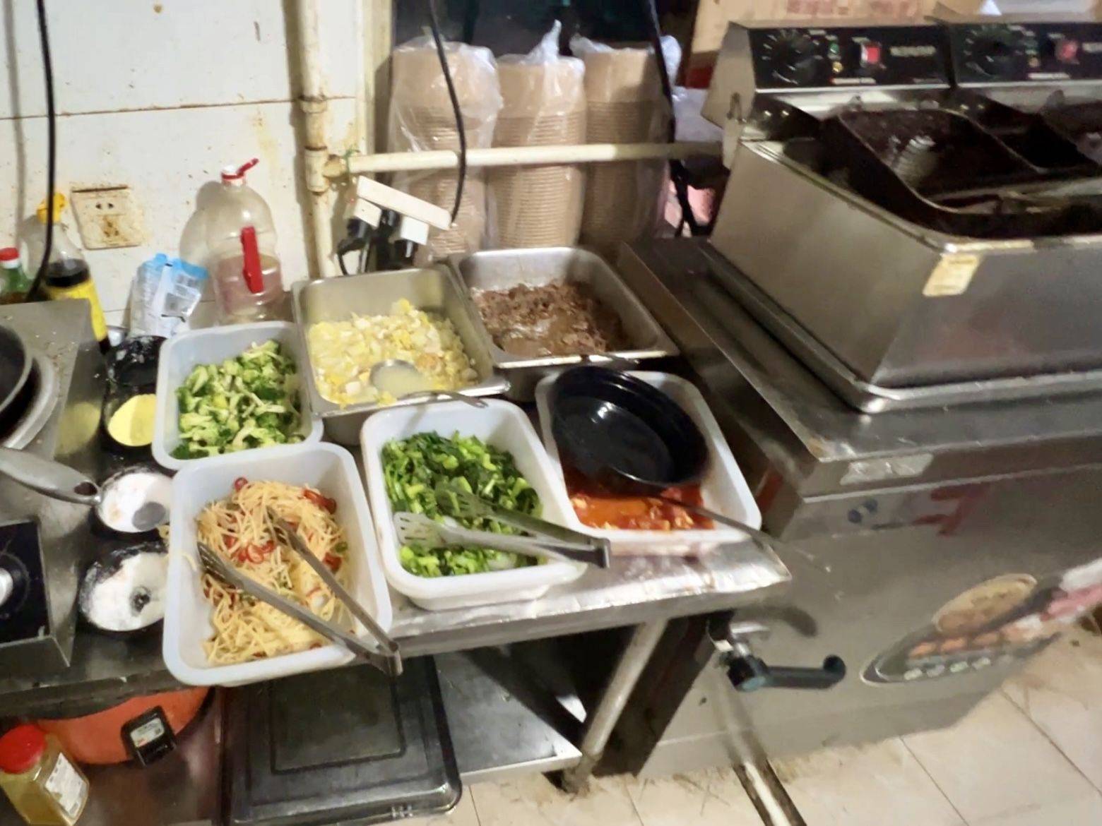贝壳财经记者和执法人员踏入二楼档口,刺鼻的气味不时令人干呕。不足百平方米的空间被隔成九个外卖档口,每个仅用简易塑钢板隔开。生鸡排、熟咖喱饭和切了一半的蔬菜堆满桌面,苍蝇在发黑的砧板上盘旋,油污斑驳的地面黏着食物的残渣。