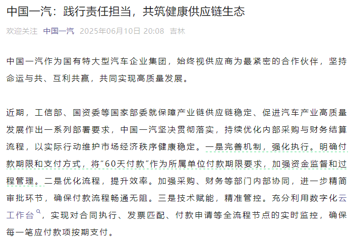 中国一汽表示,近期,工信部、国资委等国家部委就保障产业链供应链稳定、促进汽车产业高质量发展作出一系列部署要求,中国一汽坚决贯彻落实,持续优化内部采购与财务结算流程,以实际行动维护市场经济秩序健康稳定。