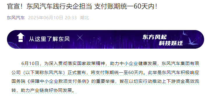 东风汽车表示,为深入贯彻落实国家政策精神,助力中小企业健康发展,东风汽车集团有限公司(以下简称东风汽车)正式宣布,将支付账期统一至60天内。此举是东风汽车积极响应国务院《保障中小企业款项支付条例》的重要举措,旨在以切实行动推动上下游资金高效流转,助力产业链良好协同发展。