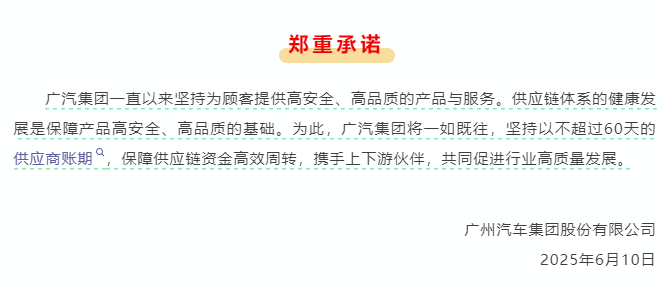 广汽集团表示,广汽集团一直以来坚持为顾客提供高安全、高品质的产品与服务。供应链体系的健康发展是保障产品高安全、高品质的基础。为此,广汽集团将一如既往,坚持以不超过60天的供应商账期,保障供应链资金高效周转,携手上下游伙伴,共同促进行业高质量发展。