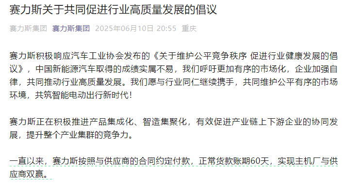 赛力斯集团表示,赛力斯正在积极推进产品集成化、智造集聚化,有效促进产业链上下游企业的协同发展,提升整个产业集群的竞争力。一直以来,赛力斯按照与供应商的合同约定付款,正常货款账期60天,实现主机厂与供应商双赢。