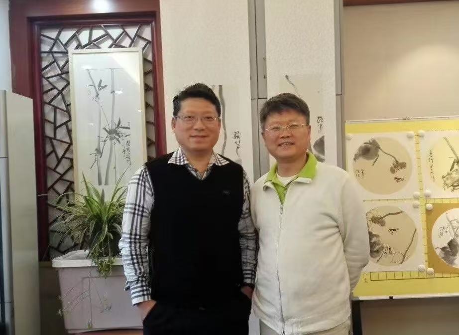 美国共工新闻社社长龚玉华与齐派篆刻家刘慧远先生。美国共工社发