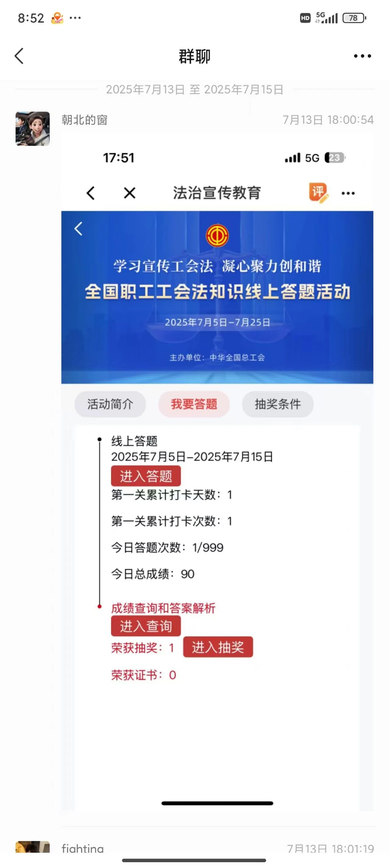为深入学习贯彻《中华人民共和国工会法》,进一步提升职工法治素养,7月12日起,挖金湾煤业公司工会在集团公司工会统一部署下,组织全体职工参加全国职工工会法知识线上答题活动。