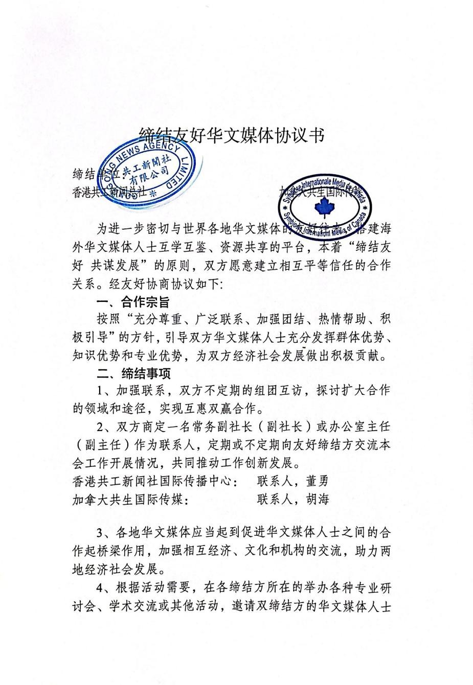 共工新闻社专题电(赵伟)2025年7月24日,香港共工新闻社国际传播中心与加拿大共生国际传媒正式签署战略合作协议,标志着两家媒体在文化传播领域的深度合作。此次合作将推动中加两地华文媒体在全球范围内加强协作,携手推动中华文化的广泛传播,为国际话语体系建设注入新动能。