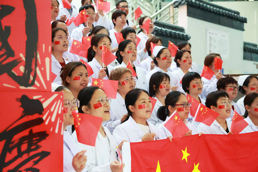 当《走向复兴》那激昂的旋律响起,全体医护人员瞬间肃然挺立,宛如一棵棵挺拔的青松。他们右手高擎国旗,仿佛在托举着祖国的希望与未来;左手轻抚心口,那是对祖国最真挚的承诺与忠诚。他们以整齐划一的动作,齐声唱响:“我们迎着初升的太阳,走在崭新的道路上……”嘹亮的歌声响彻楼宇,仿佛要冲破云霄,向世界展示着中国医务工作者的风采与力量。舞动的红旗与洁白的制服交相辉映,构成了一幅动人心魄、美轮美奂的画卷,让人不禁为之动容。