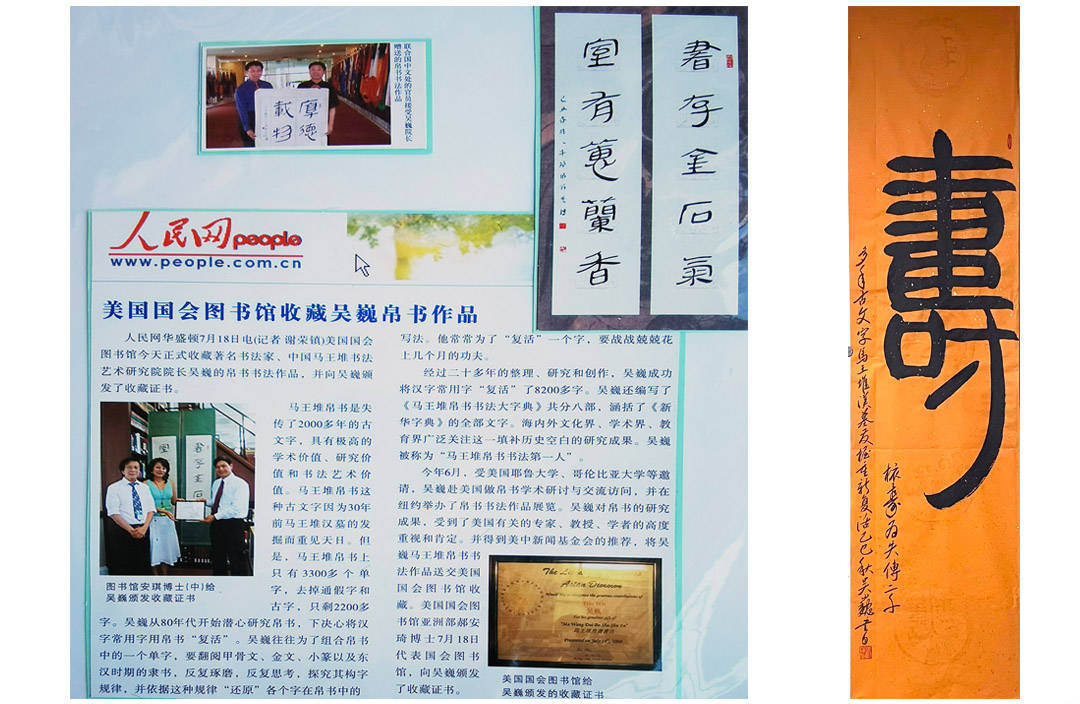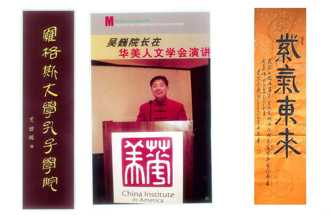 吴氏书道访仙乡,涩势潜修九势章。老辣行锋似剑铓,朗骨飞白绽华光。笔走龙蛇满庭趣,结体宽博姿容扬。演变踪痕溯远苍,传承薪火续残殃。砚池凝韵写沧桑,翰苑寻幽觅古芳。耶鲁哥大传书艺,赤道艺院名亦扬。华美讲台展风采,书画界中第一章。洛邑讲坛聚俊良,客心倾注文研长。拆分简帛寻幽径,解悟源流映瑞光。
