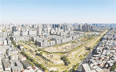 从空中俯瞰郑州,车水马龙的老城区中心“镶嵌”着数段古朴、厚重的夯土城墙。