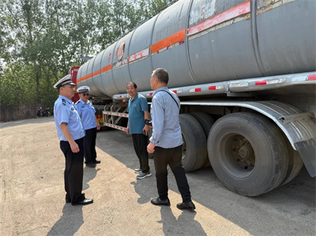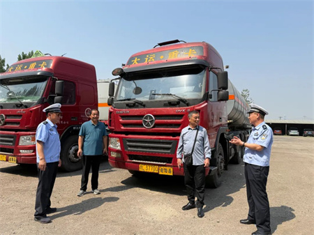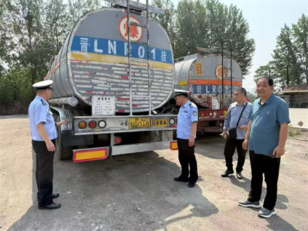 随后民警对企业的车辆台账展开了详细查阅,涵盖车辆的基本信息、年检记录、维修保养记录等,确保车辆信息准确无误,所有手续齐全合规,从档案层面保障车辆的合法合规运行。在停车场民警对危货车辆进行了实地检查。重点针对车辆的制动系统、轮胎磨损情况、灯光信号、安全防护设施以及危化品运输标志等是否符合要求进行了细致排查。对于检查中发现的问题,当场指出并责令企业立即整改,严禁“带病车”上路行驶。