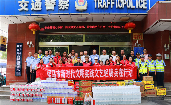 2025年7月11日,侯马市新时代文明实践文艺轻骑兵团队联合爱心商家,积极开展爱心捐赠“酷暑送清凉”慰问交警志愿活动,向在烈日下坚守一线的交警致以最诚挚的敬意。侯马市文学艺术界联合会主席淮新宏、市文网中心文明实践办公室主任杨双伟等相关负责干部参加了活动。