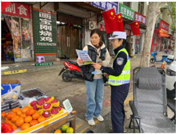 活动中,民辅警携带交通安全宣传彩页,逐一走访沿街商铺、水果摊主及菜市场经营户,将宣传资料精准发放到经营者手中。针对常见的占道经营、占道堆物等影响道路通行安全的问题,民辅警结合典型事故案例,向摊主们详细讲解占道经营对过往车辆、行人通行造成的安全隐患,强调规范经营、保持道路畅通对于保障交通安全的重要性。同时向现场群众普及过轻型货车合法装载、骑乘电动车佩戴安全头盔等基础交通安全知识,引导大家自觉遵守交通法规,养成文明出行习惯。
