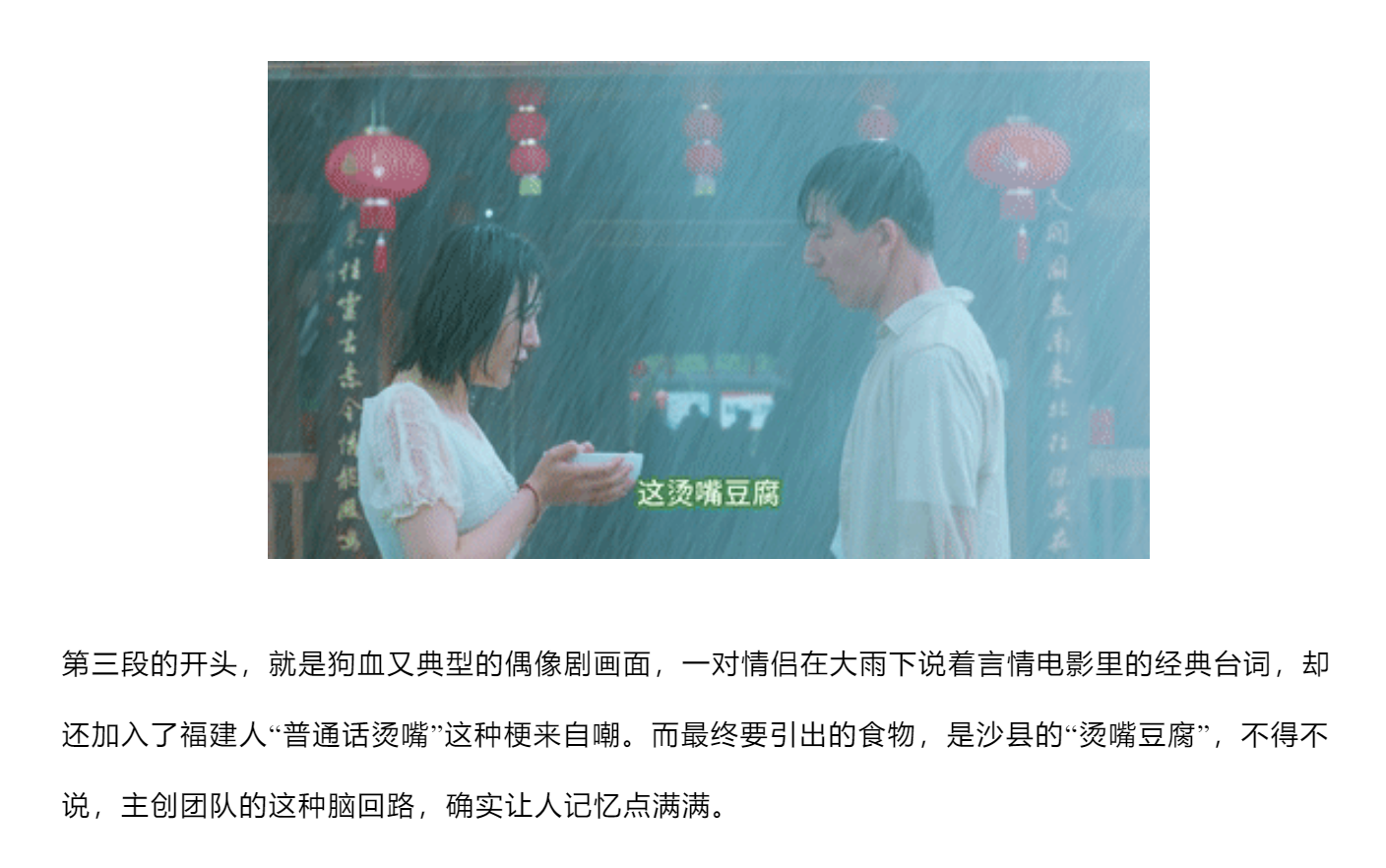 据微信号“清新福建 文旅之声”2022年5月17日发布的一条信息显示,当年5月16日,福建省文旅厅推出的首条沙县小吃文旅创意广告片《来福建,享福味》一夜时间迅速蹿红网络。该条视频时长3分39秒,用高校、偶像剧、王家卫等风格,分四个篇幅呈现了福建各地的美味佳肴。而梅州文旅被指抄袭的视频来自该条视频中的第三段,主要内容类似狗血偶像剧风格。